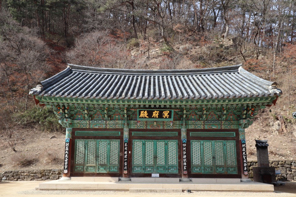 이 건물은 명부전으로 지장보살을 중심으로 염라대왕 등 10대 왕을 봉안한 절의 전각이지요. 명부는 염라대왕이 다스리는 구역을 뜻하는데 지장보살을 모시고 죽은 자들을 극락왕생하도록 기원하는 곳이며 지장전이라고도 합니다.