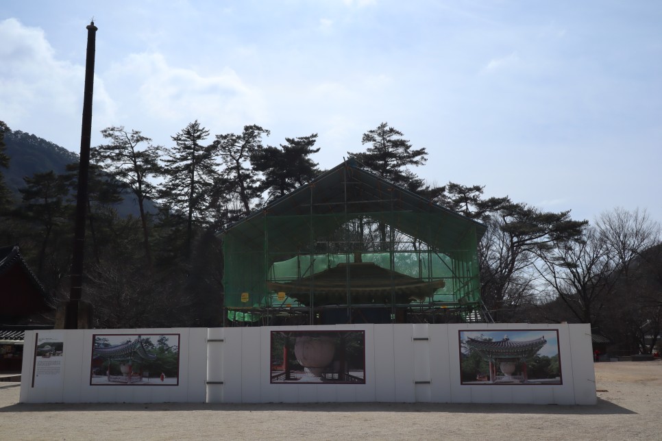 그리고 이 사진이 석연지의 모습인데 현재 수리를 하는 모양입니다.