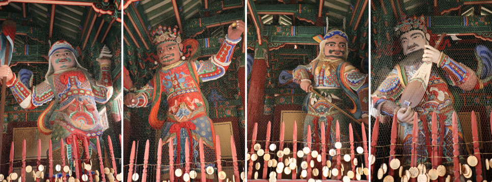 천왕문은 불법을 수호하는 수호신인 사천왕을 안치한 전각입니다. 사천왕은 원래 인도의 귀신이었는데 부처님에게 귀의하여 불법을 지키는 수호신이 되었다고 합니다. 사천왕은 동쪽의 지국천왕, 남쪽의 증장천왕, 서쪽은 광목천왕, 북쪽은 다문천왕이 있습니다.