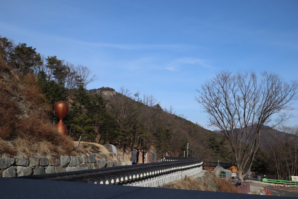 전망대로 가는 길은 이렇게 도로 위에 성문 모양으로 만든 구조물이 있는데 저 건물로 들어가야만 전망대로 갈 수가 있더라구요. 처음에는 그냥 카페 건물인 줄 알고 돌아가려고 했습니다. 원래 전망대로 가는 길에 국화들도 많이 볼 수 있다고 하는데 역시 겨울이라 흔적도 없네요. 아래쪽에 있는 주차장으로 내려가는 길에서도 단풍 구경을 할 수 있다고 하니 가을이 최적인 곳이기 한가 봅니다.