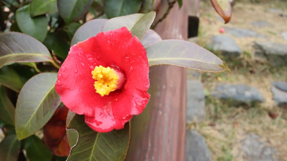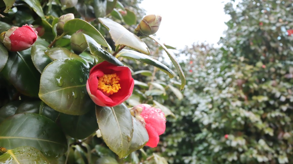 비를 맞은 동백꽃과 나뭇잎의 모습이 조금은 깨끗해 보이기는 하네요.