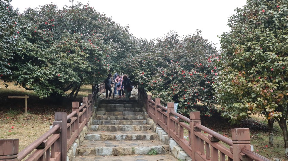 매표소 후 입구로 들어가면 오른쪽에 계단이 보이는데 그 계단은 내려오는 계단이므로 올라가지 않는 게 좋습니다. 그냥 길을 따라 들어가시는 편이 구경하기에도 좋거든요. 가는 길에도 길 좌우로 주변 관광지나 여러 가지 행사 등에 대한 안내를 볼 수도 있고 동백 나무들도 심어져 있으니 구경하면서 천천히 들어가시면 됩니다.