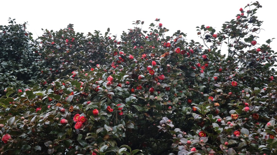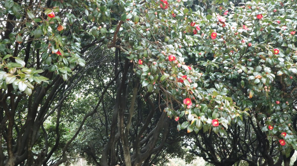 사실 동백꽃이 붉은색이기는 해도 화려한 느낌보다는 약간 칙칙한 느낌이 나는 꽃이라 나무 전체를 봤을 때는 그렇게 이뻐 보이지는 않습니다. 그래서 꽃만 찍는 경우가 많고 나무를 찍으면 잘 표가 나지도 않지요.