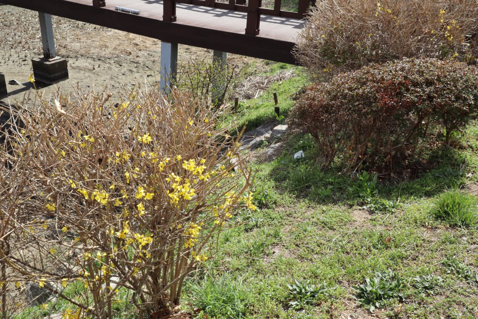 그리고 중앙호수공원 주변에 철쭉 같은 꽃 나무들도 많이 심어져 있어서 꽃이 피면 이쁠 것 같다는 생각이 듭니다. 그 옆에 개나리도 피어 있었지요.