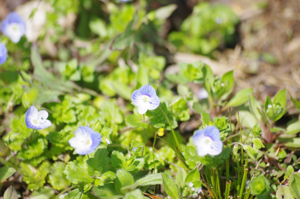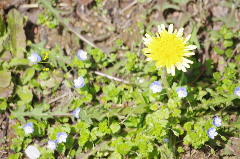 아래쪽을 보면 벚꽃이 아닌 것들도 피어 있는데 서양민들레와 봄까치꽃입니다. 요즘 산과 들에서 많이 볼 수가 있는 대표적인 들꽃이지요.