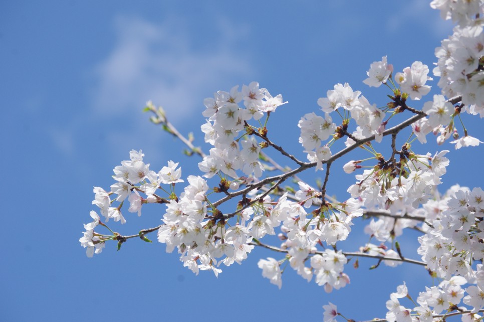 꽃 구경은 이 맛에 하는 것 같아요. 특히 파란 하늘과 하얀 구름 그리고 분홍빛의 벚꽃이 피어 있는 모습은 한 장의 그림을 보는 듯하네요.