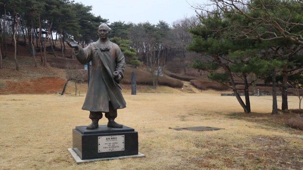 가장 먼저 눈에 들어오는 것이 이 한용운 선생의 동상입니다. 만해 한용운 선생은 1879년에 태어나서 1944년에 돌아가셨는데 동학혁명과 의병운동을 보고 나라를 구하겠다는 일념으로 집을 나왔다가 인생은 무엇인가라는 문제를 풀기 위해 백담사에 들어갔다가 출가해서 정식 승려가 되었다고 하지요. 이후 민족대표 33인의 한 사람으로 독립을 위해 힘쓴 분이라고 알려져 있습니다.