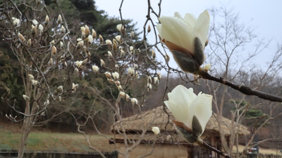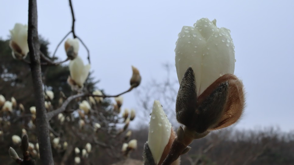 이제 왼쪽에 있는 사당인 만해사로 가는데 여기에서도 이제 하얀 몽우리를 피우고 있는 목련의 자태를 구경하게 되네요. 이슬을 머금은 듯 물기가 서려있는데 사실은 비가 와서 그런 것이랍니다.