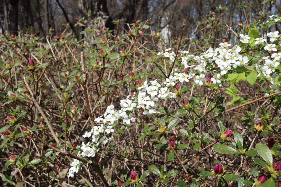 점심때가 지났는데 아직 식전이라 이제 돌아가야겠습니다. 계속 걸어도 주변의 산책로로 연결이 되어 있어서 나중에 돌아오기가 힘들 것 같아요. 적당히 움직이는 것이 좋지요. 돌아가는 길에도 조팝나무꽃과 아직은 덜 핀 철쭉을 구경하고 가지요.