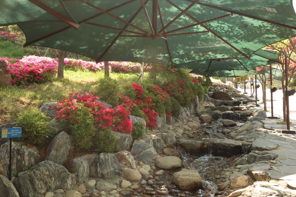 왼쪽에는 물이 흘러내리는 도랑이 있는데 이 물은 동굴에서 나오는 물입니다. 주변에 철쭉들도 많이 피어 있어서 화사한 모습이지요.