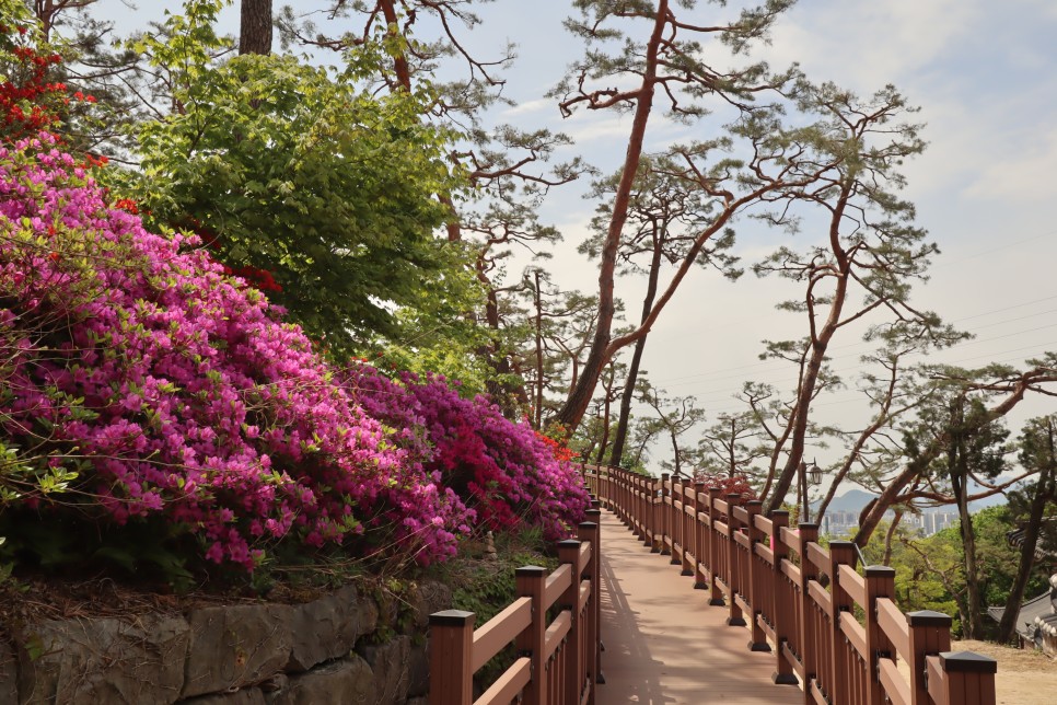 나무 데크 길을 따라가는데 이곳에도 역시 철쭉들이 화사한 모습을 보여주고 있습니다. 이 길을 가면 끝에 여러 가지 비석들이 있으니 잠시 들렀다 가시면 됩니다.