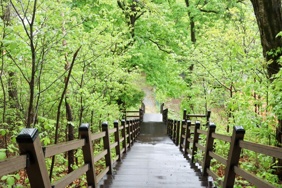 그런데 이곳에서 길을 잃었습니다. 정자로 가는 길이 보이지가 않네요. 이정표도 없습니다. 도로로 나갔다가 다시 돌아와서 주변을 둘러보니 식당 왼쪽에 길인 듯 한 곳이 보이네요. 그래서 그 길을 따라가니 이 계단이 나타납니다.