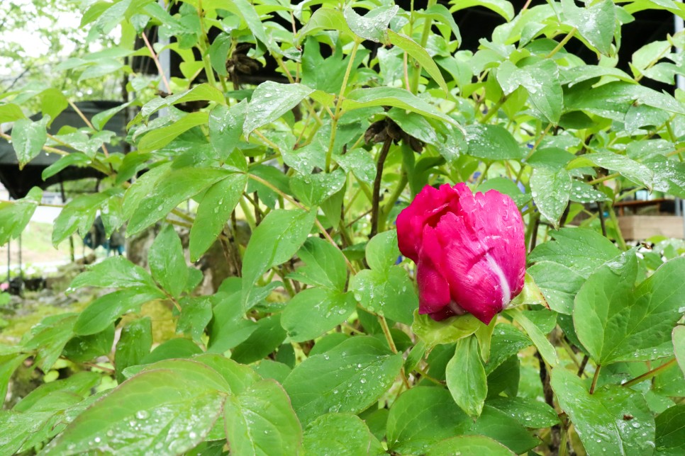 식당 앞에 이 꽃이 피어 있는 모습이 보이는데 비 때문에 잎이 거의 벌여져 있는 상태라 그나마 어느 정도 완전한 모양을 갖춘 것을 찍어봤지요. 모란입니다. 이제 모란과 작약도 피고 있나 보네요.
