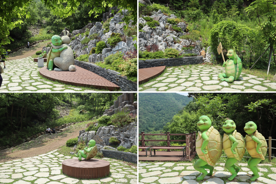 이제 거북바위정원을 구경하도록 하겠습니다. 역시 좌구산이라 거북이를 이용한 조형물들이 많이 보입니다. 그리고 거북이와 함께 얘기에 등장하는 토끼도 보이네요.