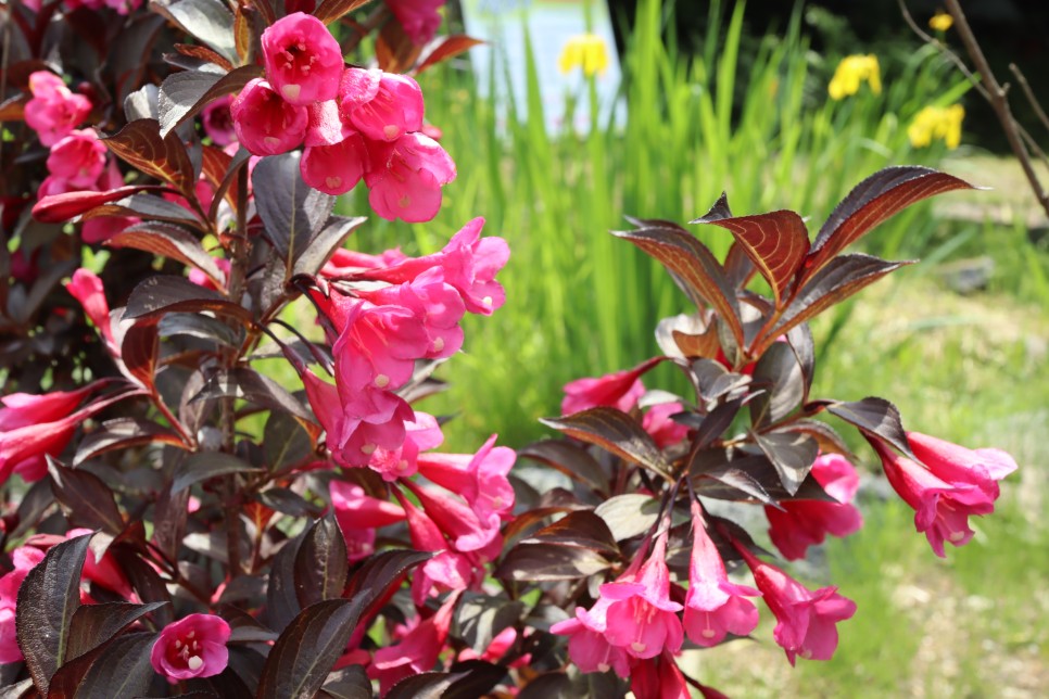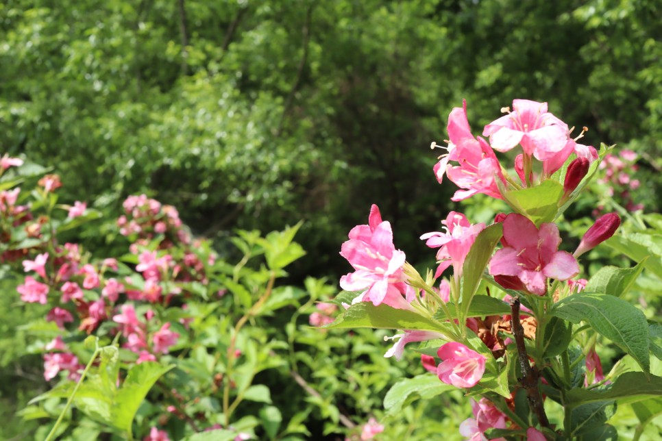 아, 그런데 이곳에 색감이 아주 진한 분홍 병꽃나무꽃이 보입니다. 하얀색을 띠는 것은 본 적이 있지만 이렇게 진한 색은 처음 보는 것 같습니다.