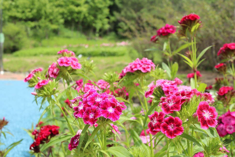 그런데 이쪽에 다른 꽃도 보이네요. 패랭이꽃들입니다. 색감은 진한 분홍색들이라 작약과 견줄만한 것들이지요.