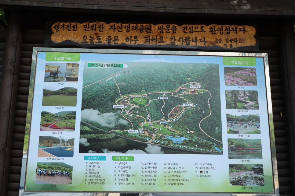 집들도 별로 보이지 않는 한적한 시골길을 차로 달려서 도착을 한 곳은 진천에 있는 만뢰산자연생태공원입니다. 도시를 벗어나서 시골을 가면 집들이 보여도 듬성듬성하게 느껴지는 것은 그만큼 도시가 복잡한 까닭이겠지요. 만뢰산자연생태공원 주위에는 그럼에도 식당과 카페 등의 건물들이 좀 보이는 곳이라 사람들이 북적이는 모습을 볼 수는 있을 것 같습니다. 주차장은 넓은 편이라 불편함이 없었는데 이 안내도를 찍으려고 하는데 주차된 차 때문에 바로 찍을 수가 없었지요.