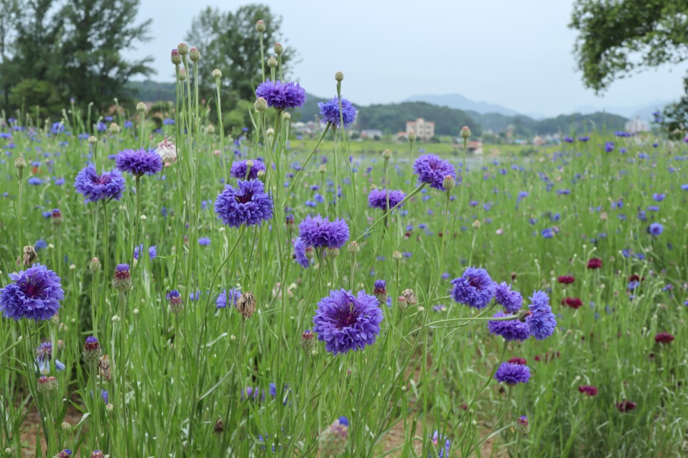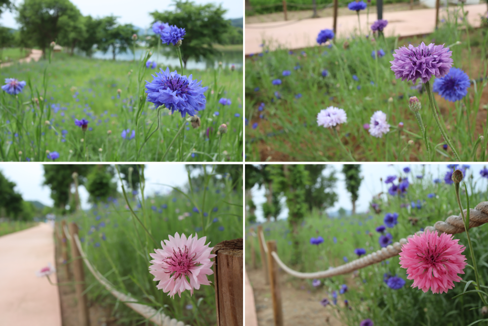 저는 오른쪽의 길을 걸어서 반시계 방향으로 도는 경로를 설정을 했습니다. 그렇게 걸음을 옮기는 데 이곳에도 수레국화가 많이 보입니다. 아직은 개양귀비꽃들과 비슷하게 만개를 한 상태는 아닌 듯한데 그래도 이렇게 구경을 하니 기분이 좋네요. 그리고 수레국화가 이렇게 색상이 다양한지는 처음 알았습니다.