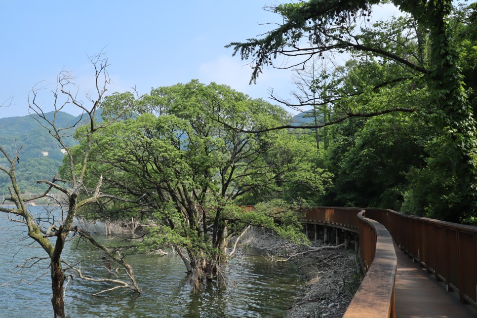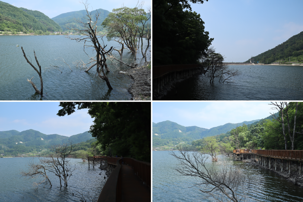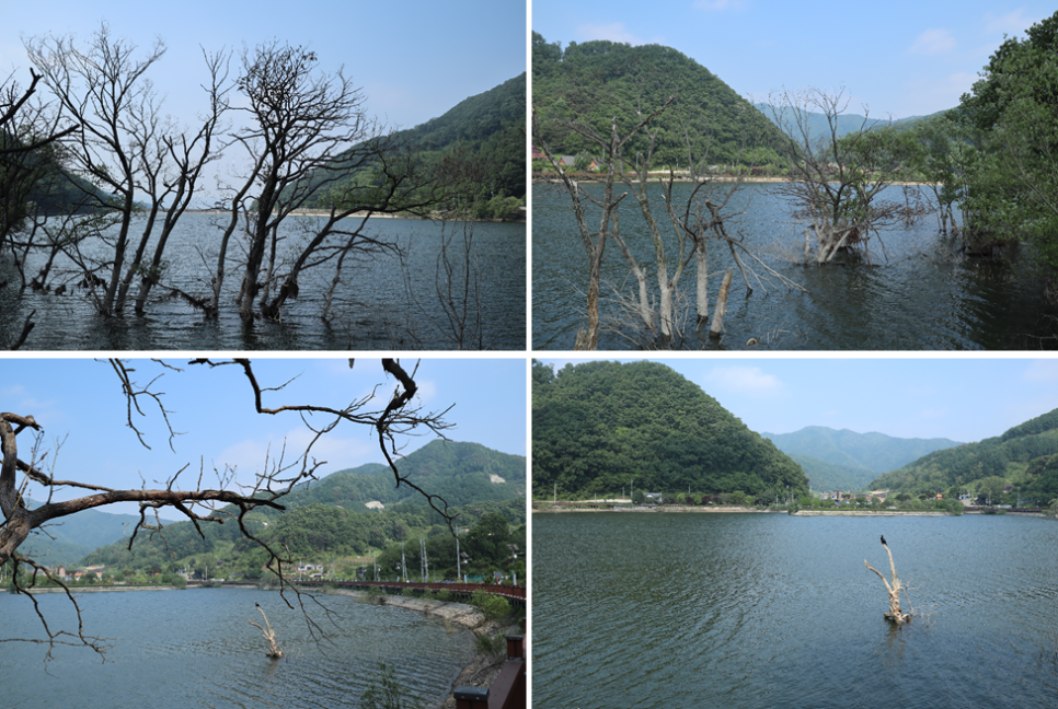 이쪽 길은 고목들이 저수지 물속에 보이는 모습이 보기에 운치가 있어 보입니다. 하지만 죽은 나무가 있는 곳은 그렇게 기뻐할 일은 아닌 것 같아요.
