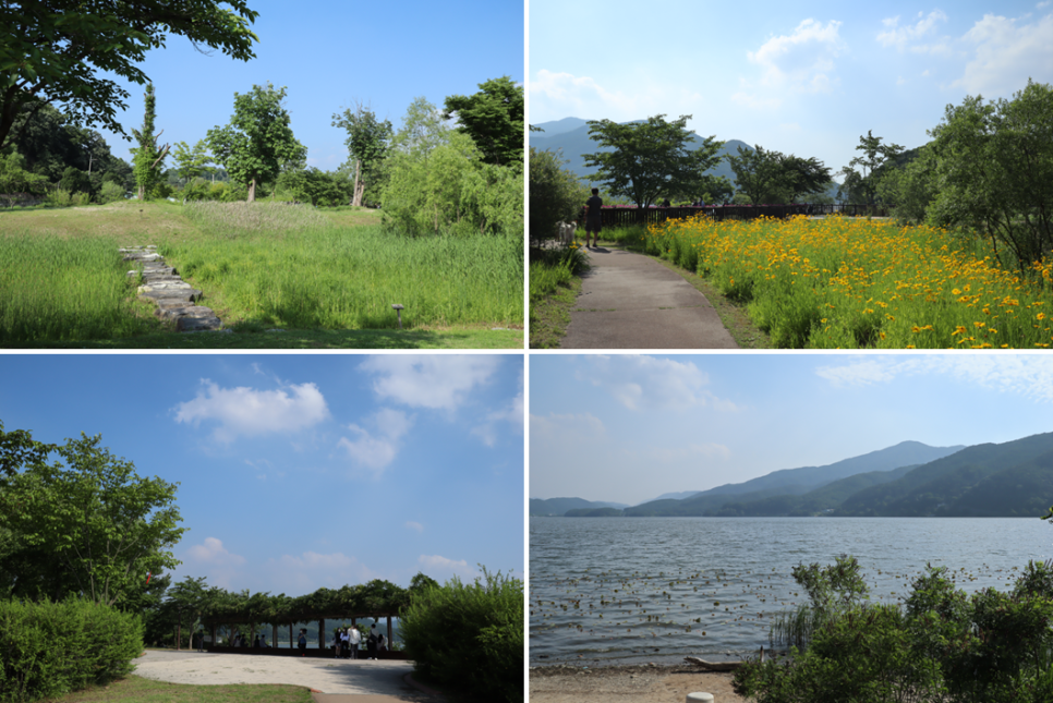 나무들과 풀들이 우거진 산책로를 걷다 보면 다른 금계국 꽃밭을 만나기도 하고 휴식을 할 수 있는 쉼터도 있지요. 하지만 사람들이 많아서 그냥 지나만 갑니다. 저도 쉬고 싶은데...^.^ 그리고 팔당호가 바로 보이는 곳에는 연꽃의 흔적들도 보입니다.