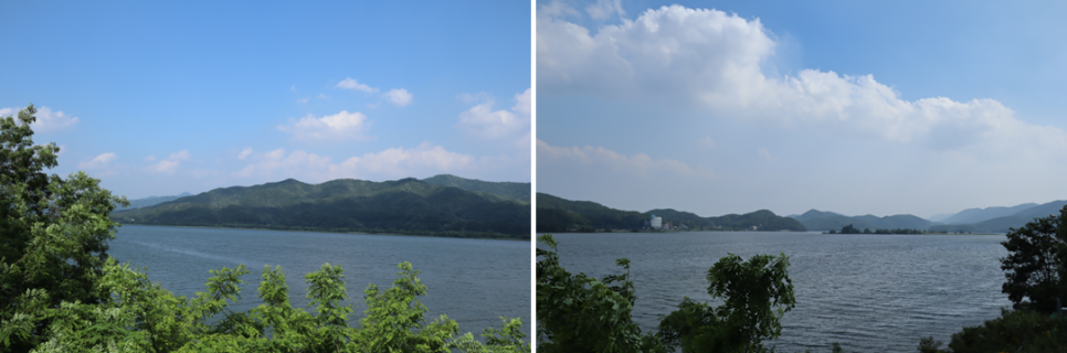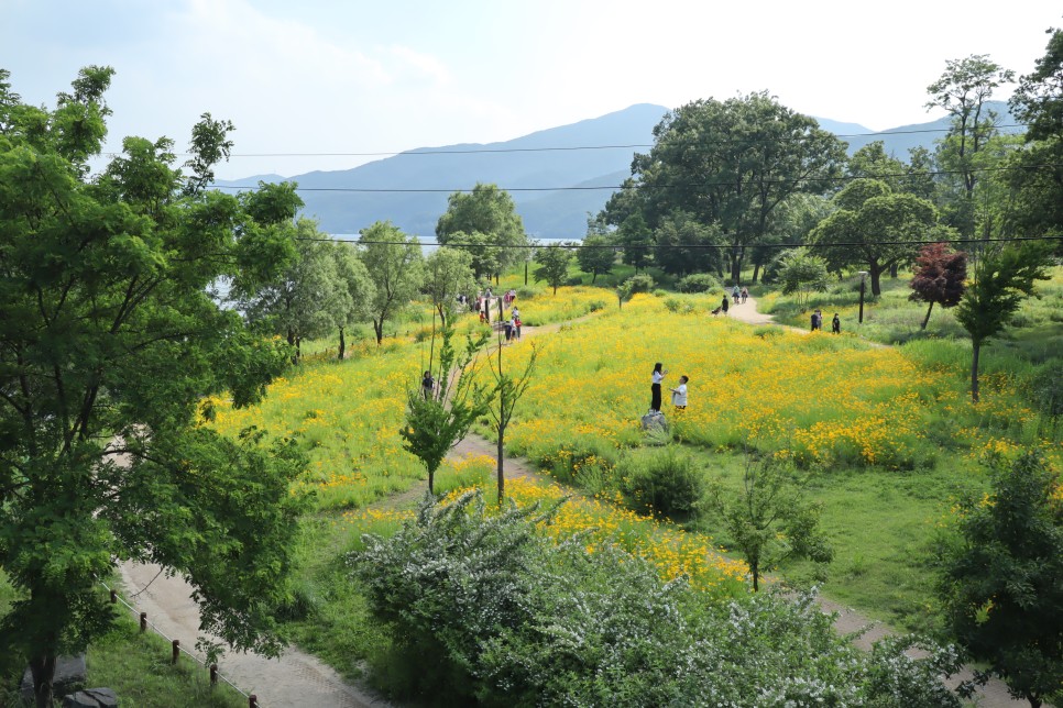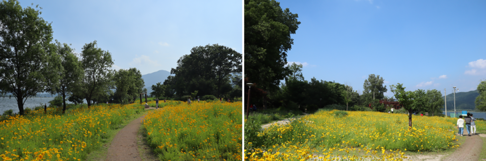전망대에서 좌우 모습을 찍어보는데 그냥 팔당호가 보이는 모습입니다. 다만 오른쪽으로 요즘 많이 보이는 금계국 꽃밭이 있는 것이 눈에 들어옵니다. 저도 이곳이 처음이라 금계국을 이렇게 볼 줄은 몰랐는데 너무 기분이 좋습니다.