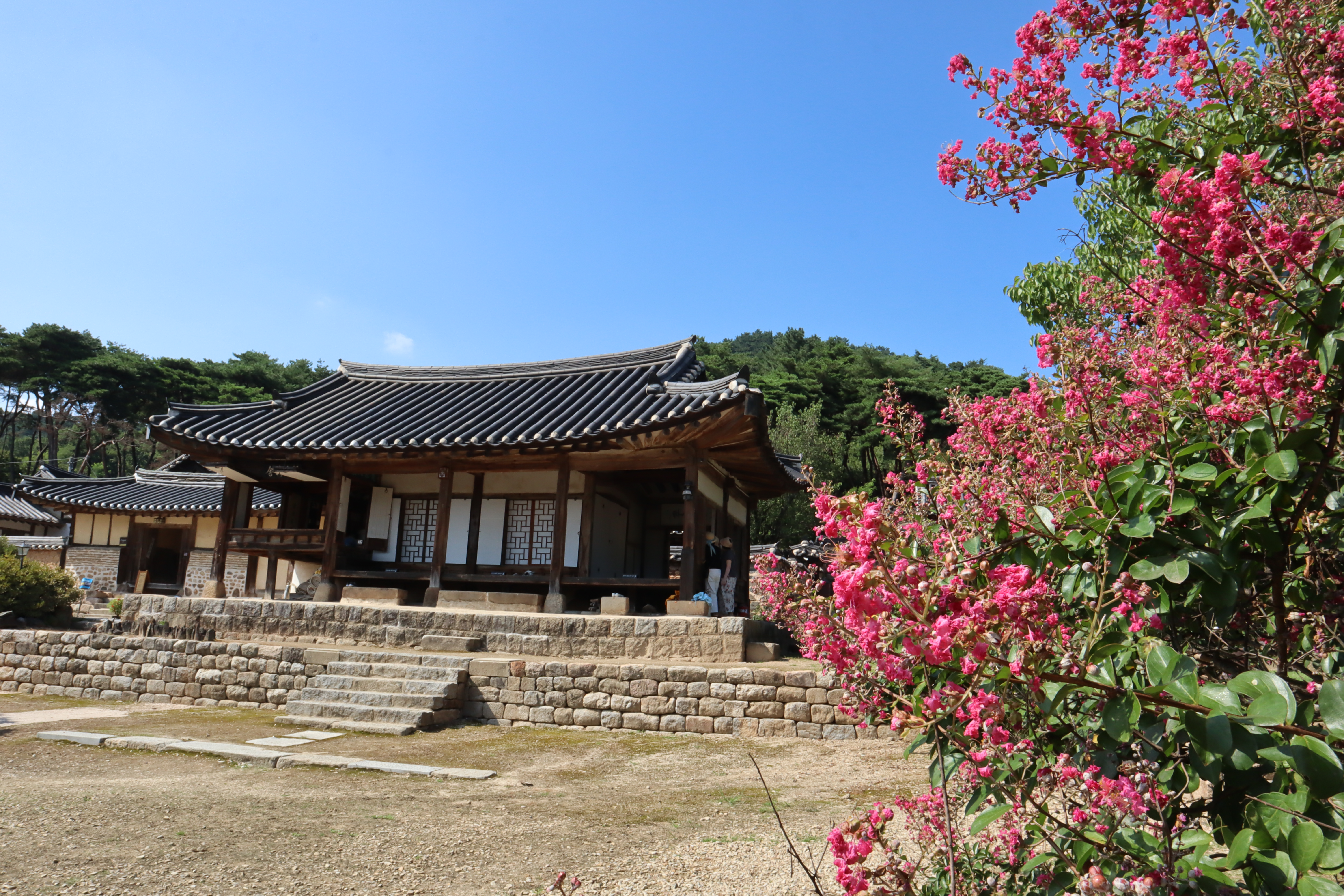 그래서 이 꽃들을 많이 보려면 충남 논산 쪽으로 가야 하는데 특히 향교나 고택 같은 곳에 옛날부터 이 나무를 많이 심어서 구경을 하기가 좋습니다. 바로 배롱나무꽃인데 공주나 논산 지역에 있는 한옥들과 잘 어울리는 꽃인 것 같아요.