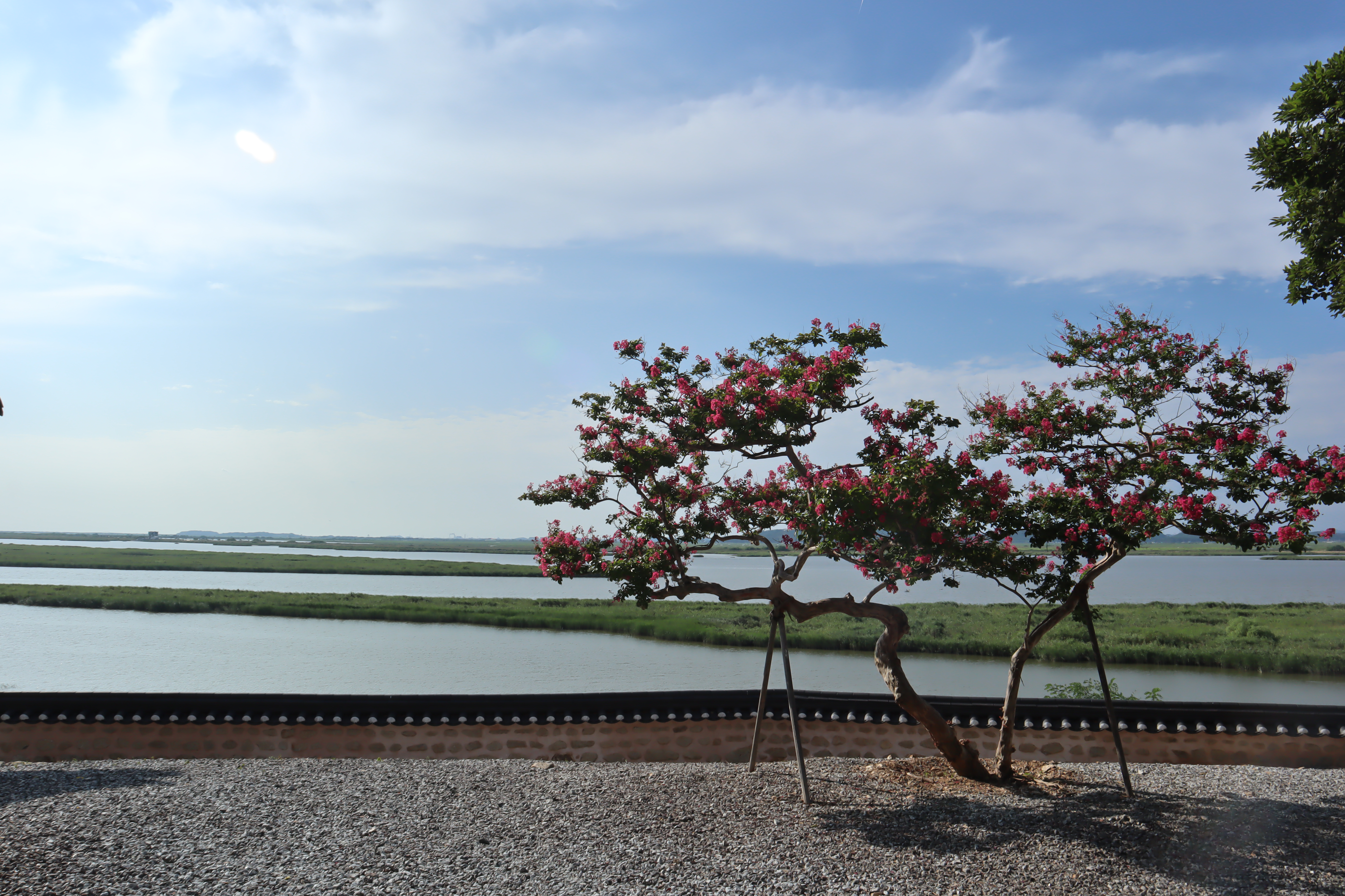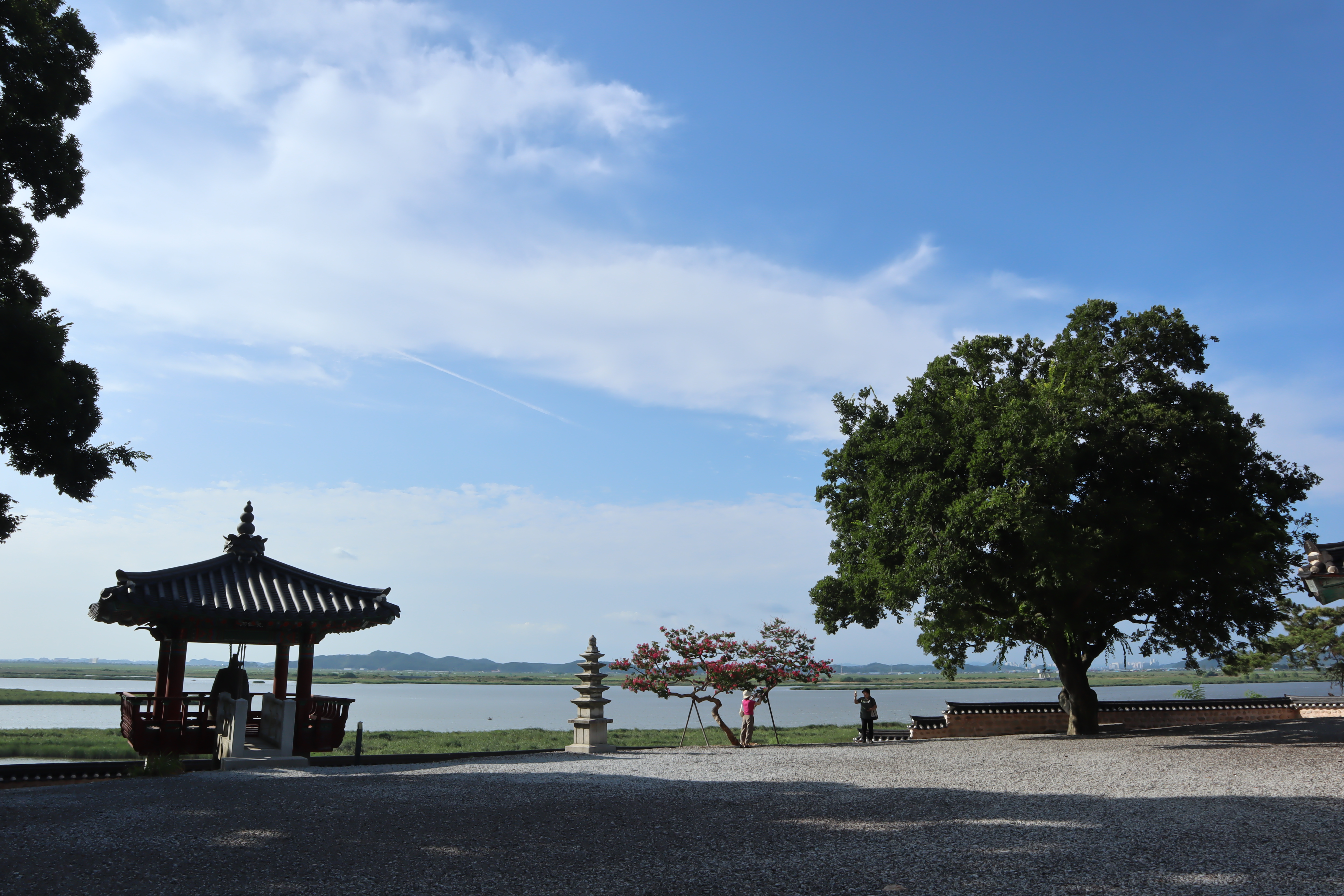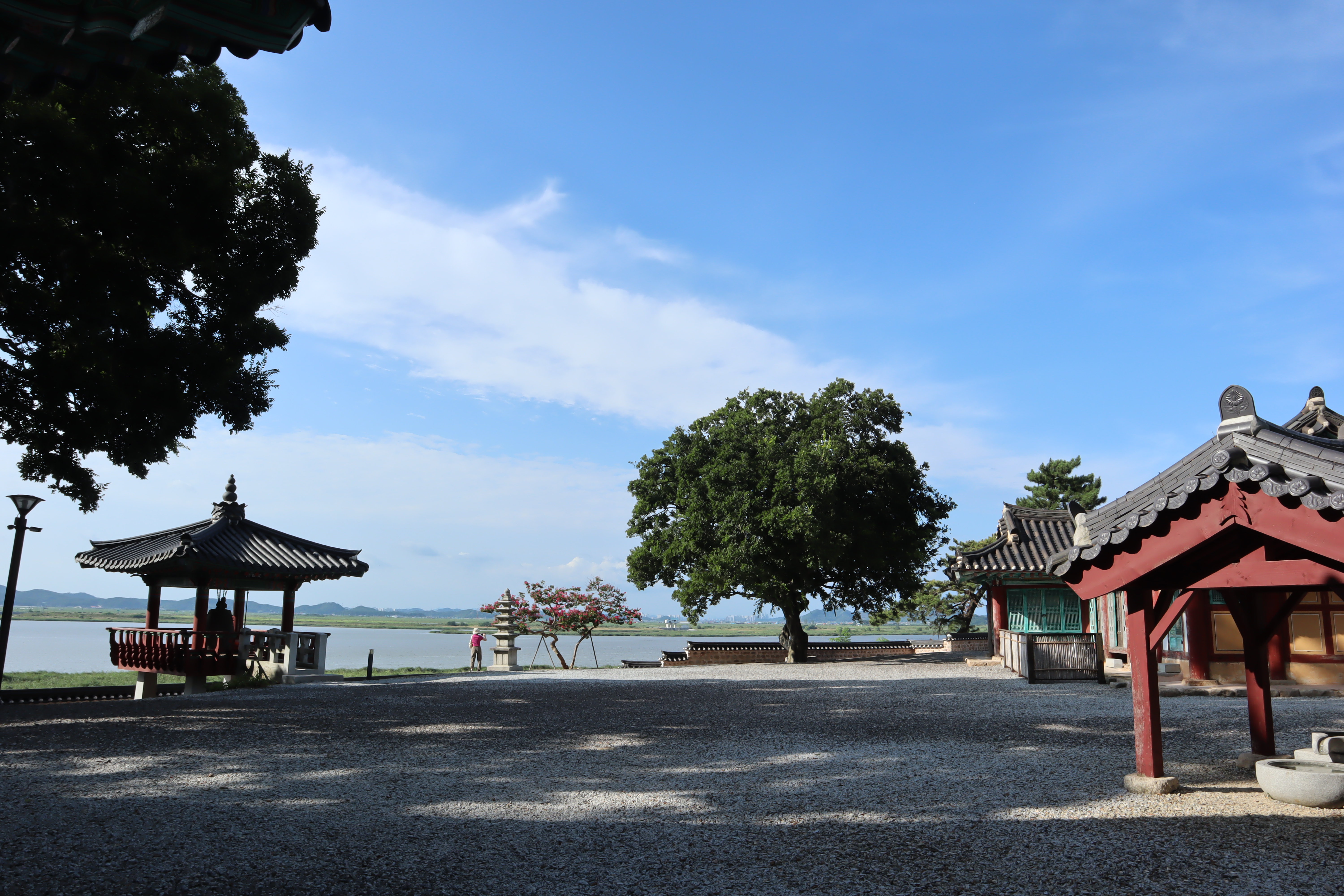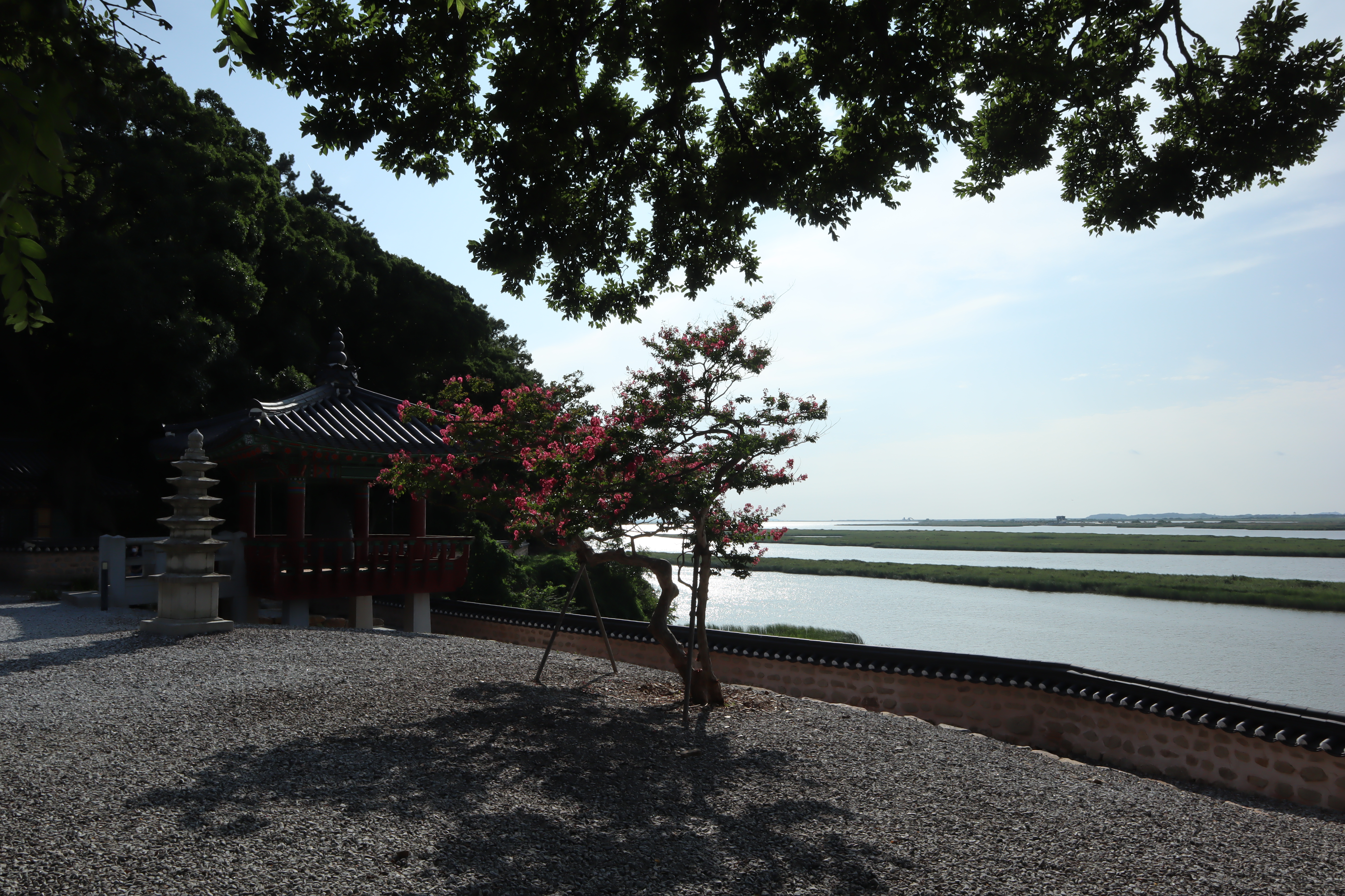 종각과 오층 석탑 그리고 강을 배경으로 배롱나무와 함께 사진을 찍으면 멋진 풍경이 됩니다.