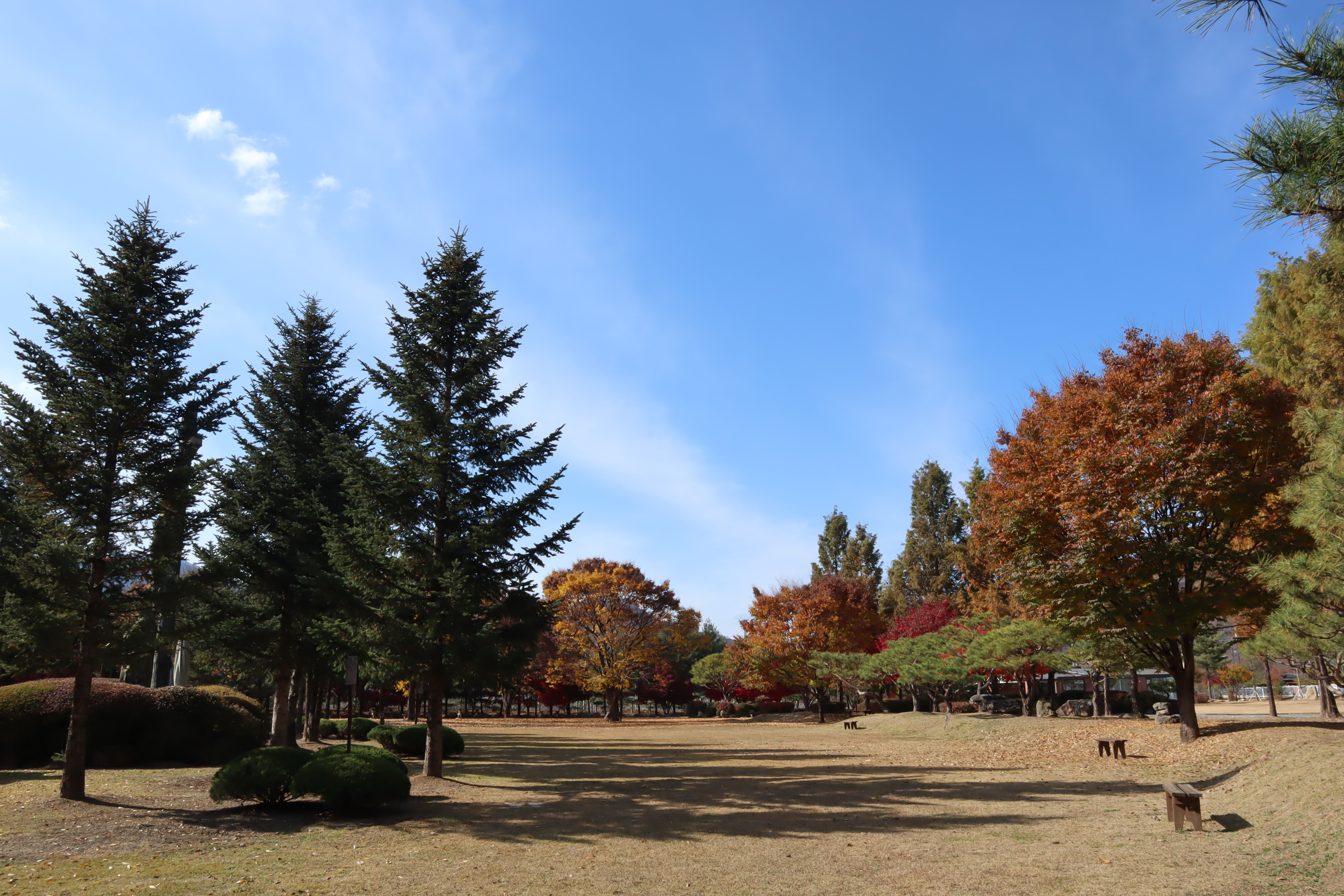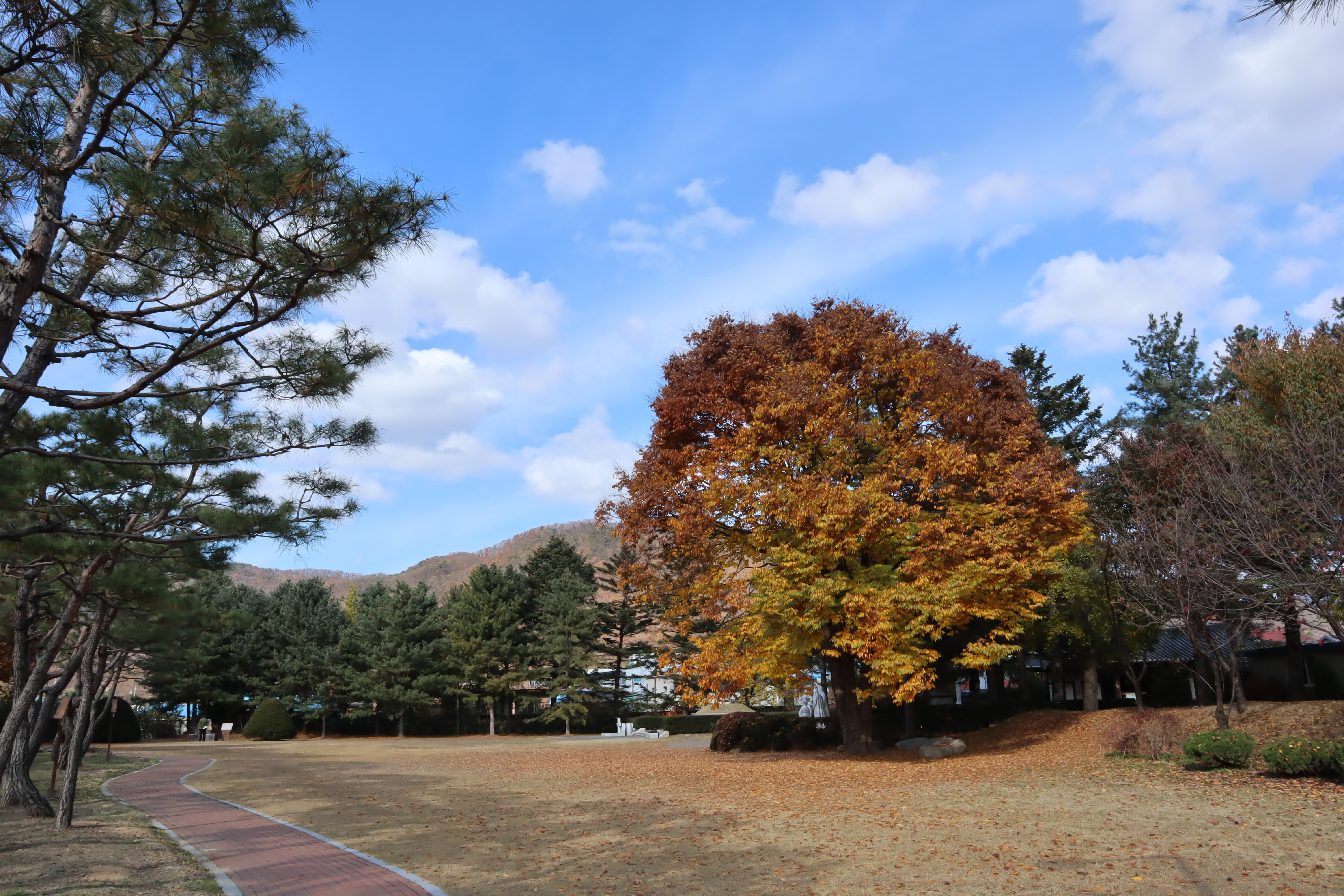 특히 나이가 많아 보이는 느티나무 몇 그루가 여러 곳에 보이는데 단풍이 든 모습과 함께 바람에 잎이 떨어지는 모습이 너무 환상적인 곳이더라구요. 여러 곳을 구경을 해 보았지만 날씨마저 이렇게 도움을 주는 경우는 처음이었습니다.