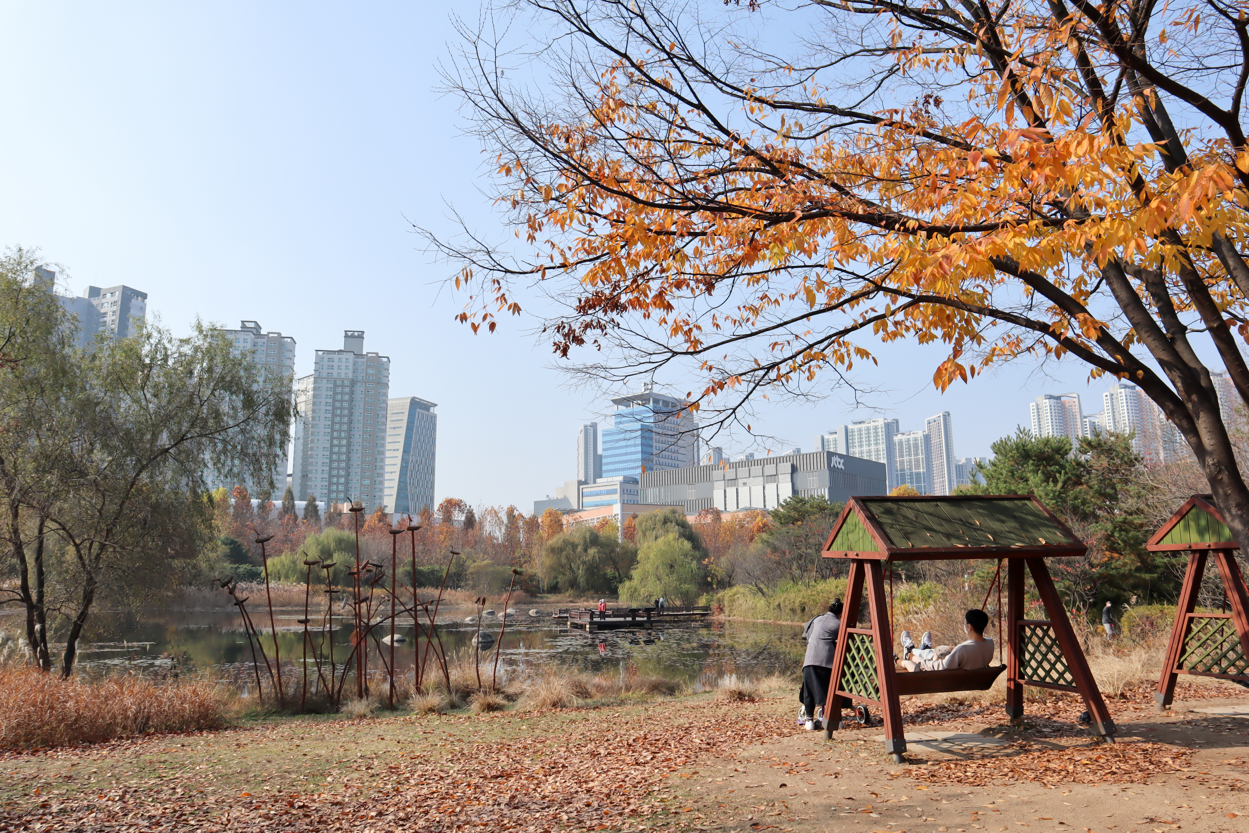 전통정원으로 가는 길에 호수의 모습을 보면 흔들의자와 조형물들이 있어서 고즈넉함이 더욱 풍성해 보이는 곳이기도 합니다. 그리고 일산호수공원은 일몰 때나 밤에 찾아도 야경이 좋은 곳이기도 하지요.