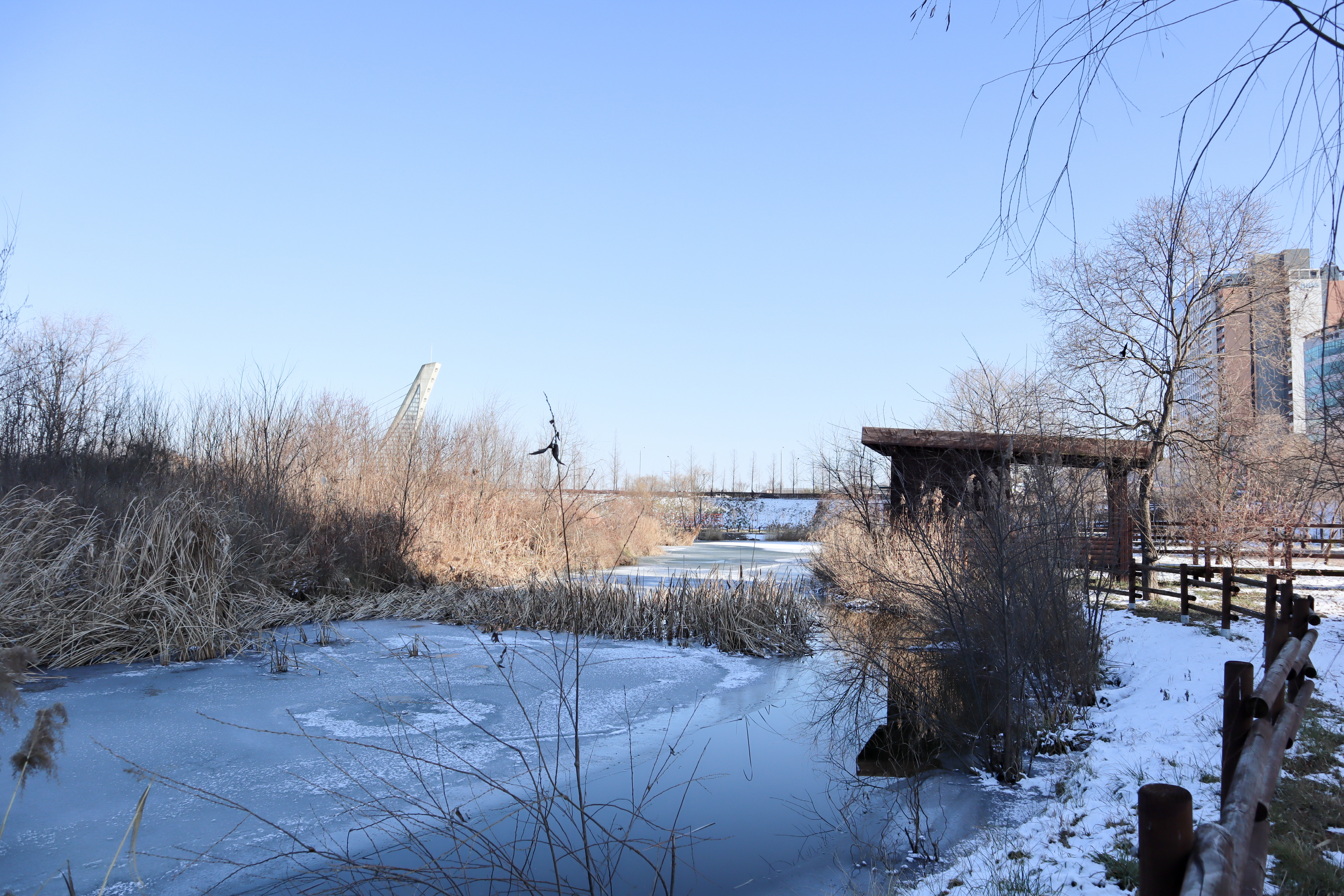 봄과 여름에는 연꽃단지에서 습지를 통과해서 레솔레파크로 이동을 하면서 연꽃 ,꽃창포 , 인동넝쿨, 장미, 금계국, 알리움, 가자니아 등 온갖 꽃들을 구경할 수 있었지만 역시 겨울에는 보이는 것이 갈대와 헐벗은 나무들뿐이네요.