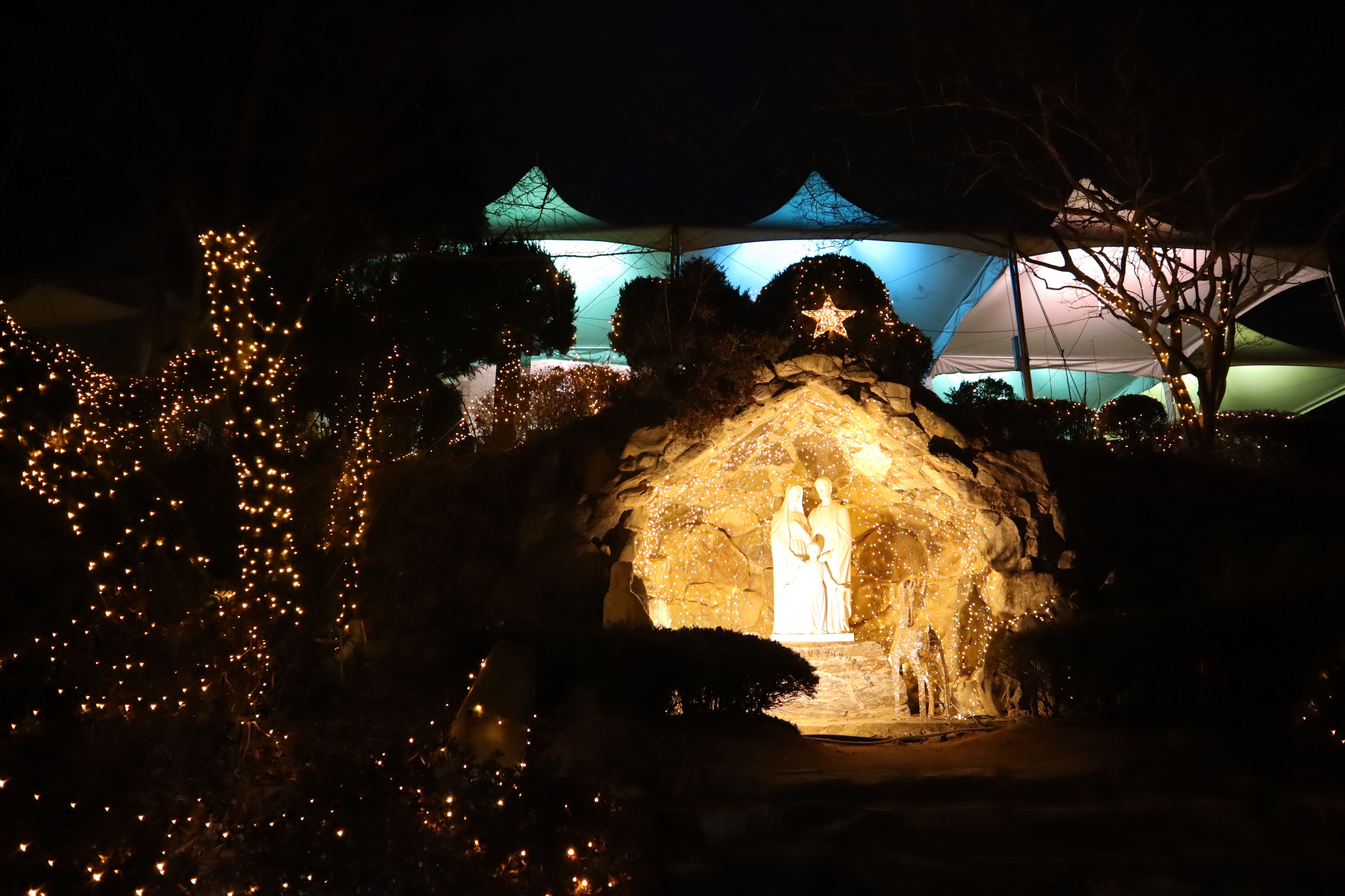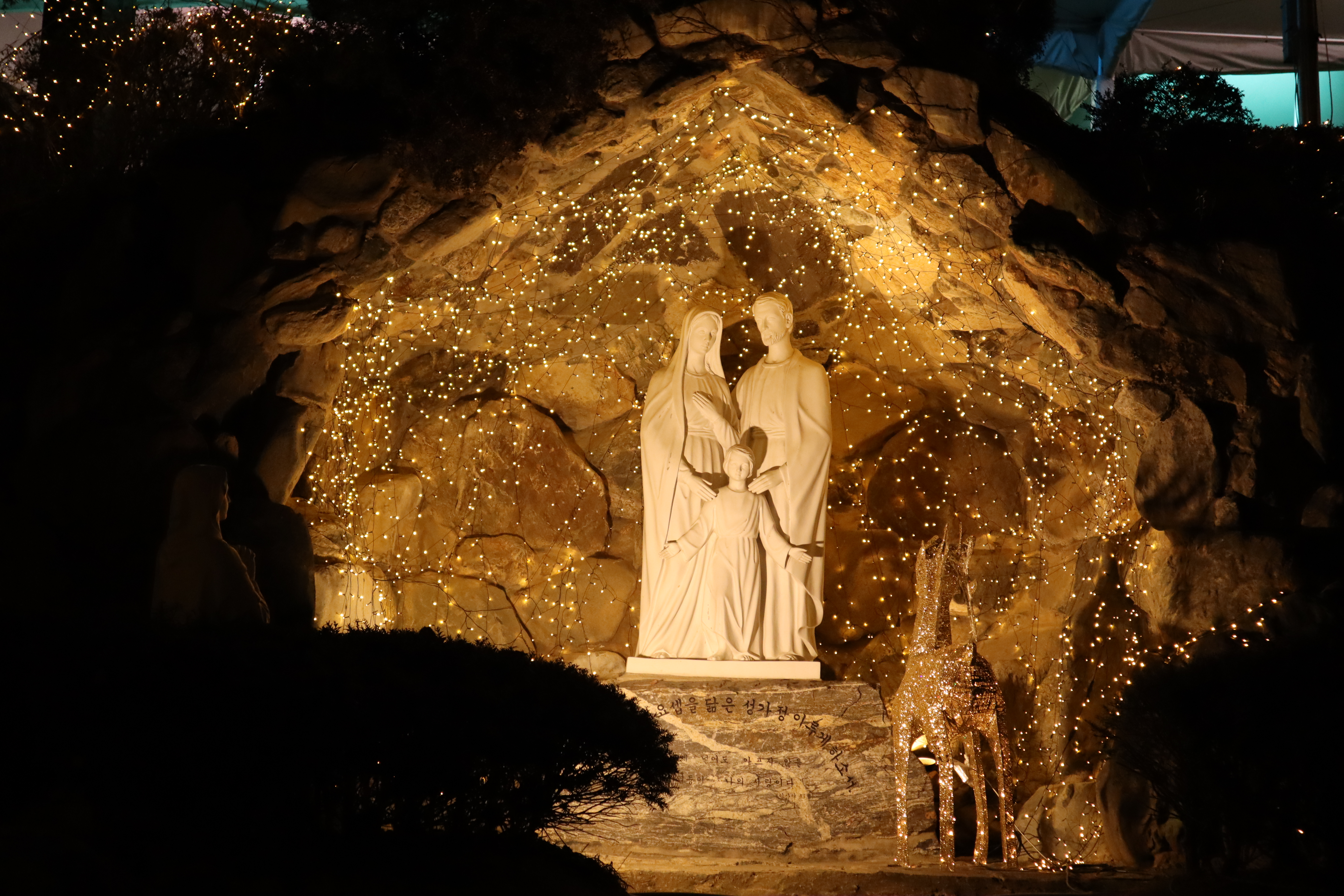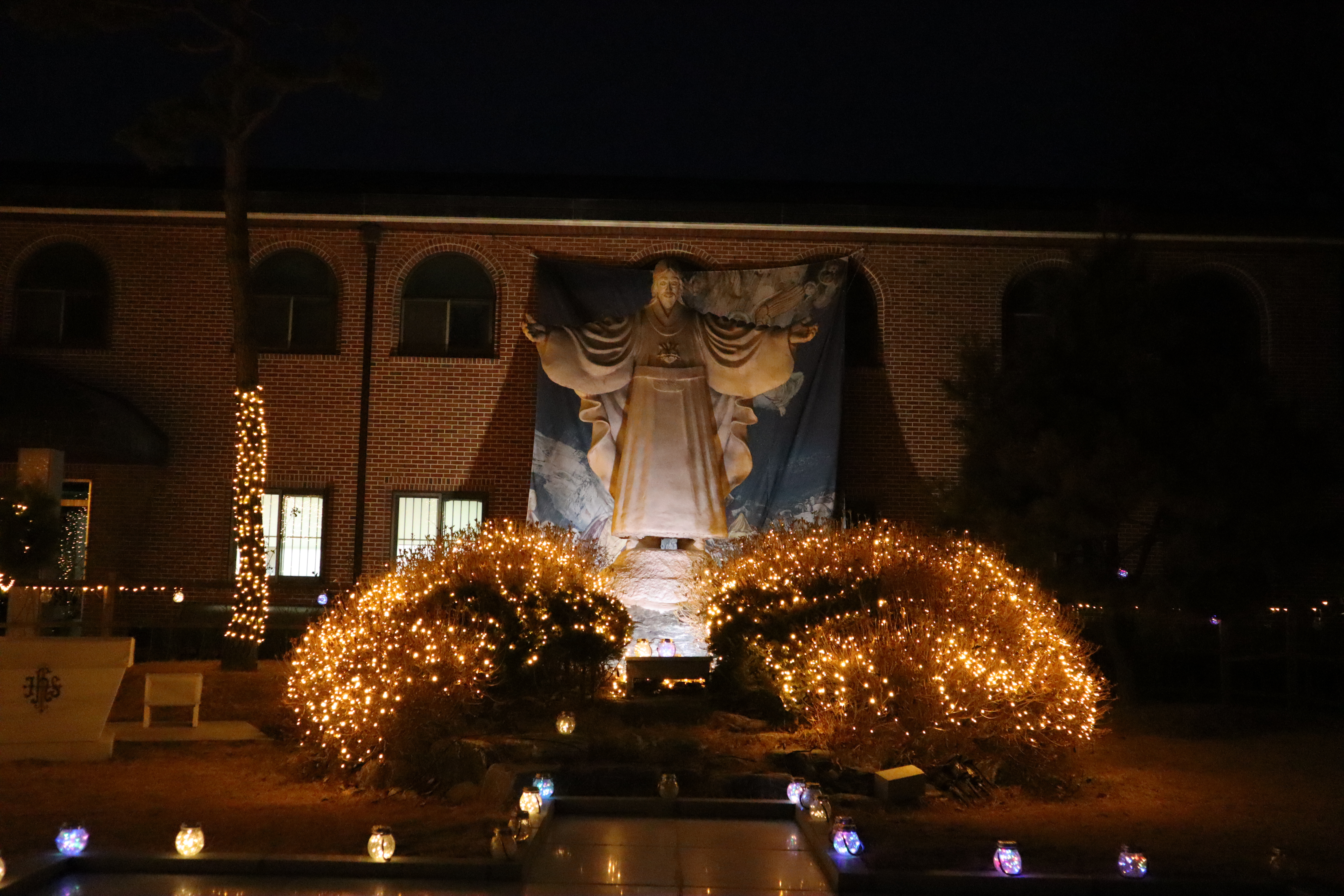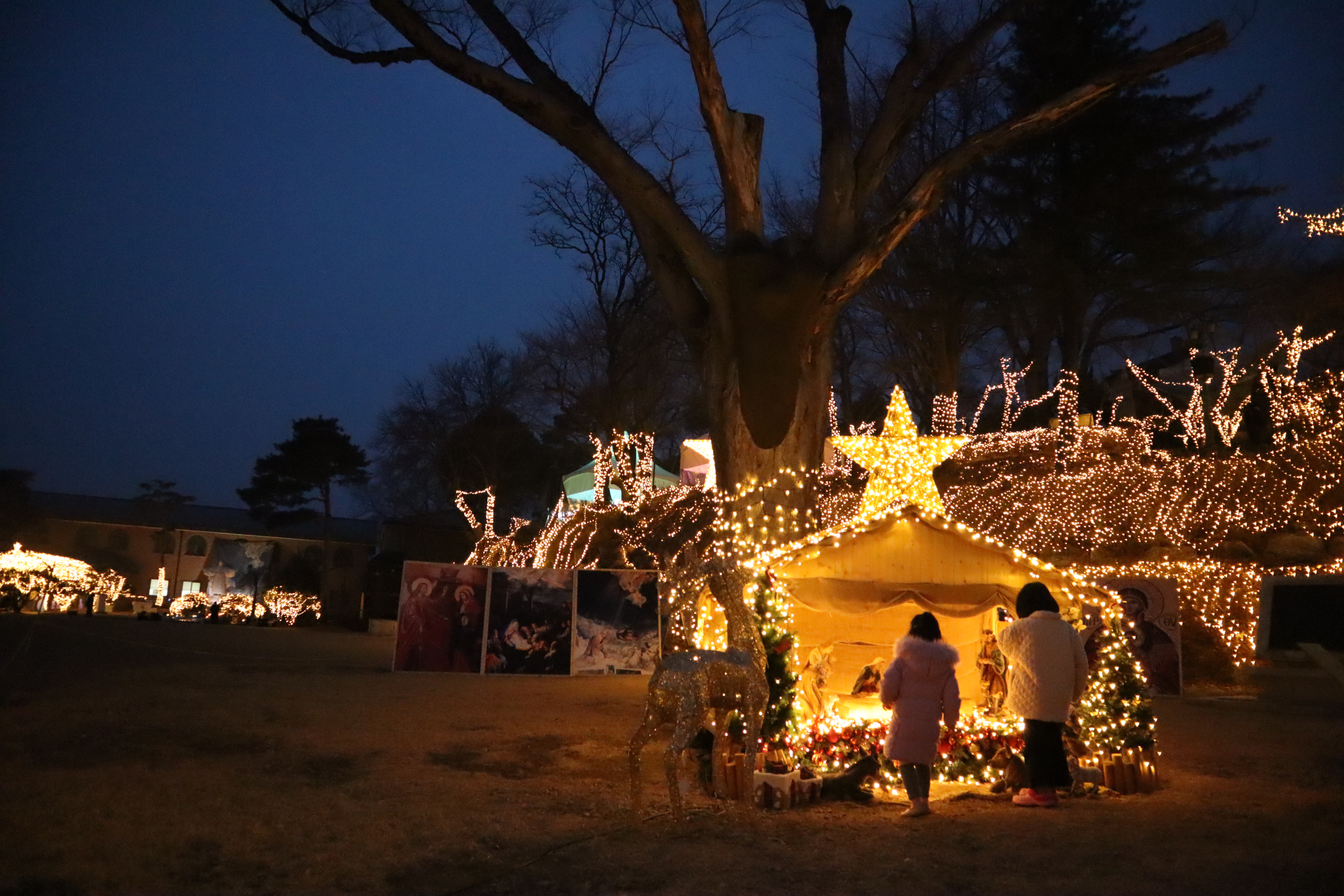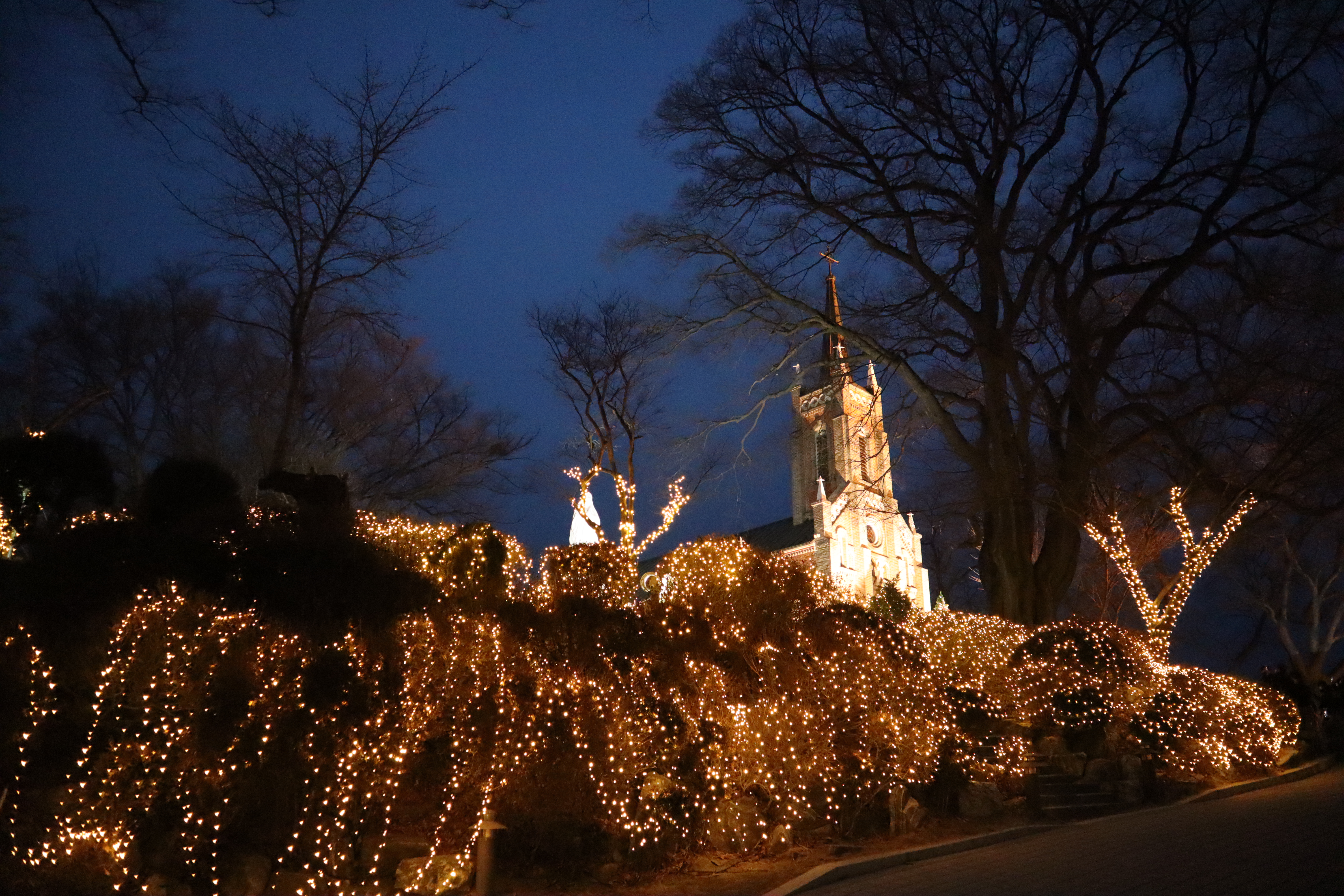 입구에서부터 시작되는 조명 불빛들은 나무와 조형물을 밝히고 있는데 한 가지 색상만 사용한 것이 화려하지 않고 성스러운 기분을 더 느끼게 하는 듯했습니다.