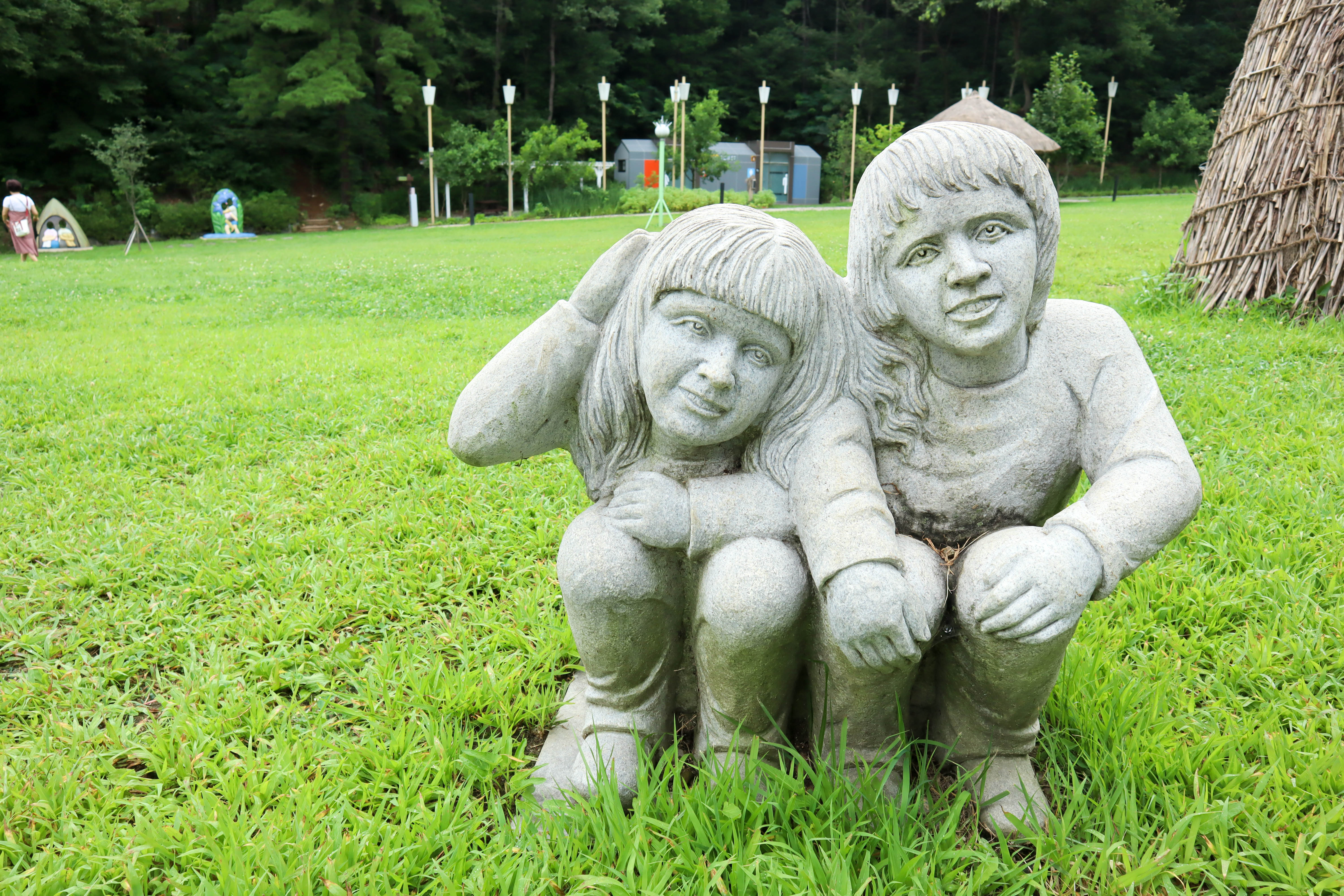 문학관을 구경하고 밖으로 나오면 잔디광장이 있는데 이곳이 소나기 광장으로 소나기의 각 장면들을 기억할 수 있는 조형물과 시설들이 구경을 하기에도 좋지만 역시 연못과 분수 그리고 각 시간에 가동되는 소나기 분수 쇼가 시원하다고 하네요. 비가 오거나 하면 가동을 안 하지만 시원하게 즐길 수 있어 아이들이 좋아한다고 합니다.