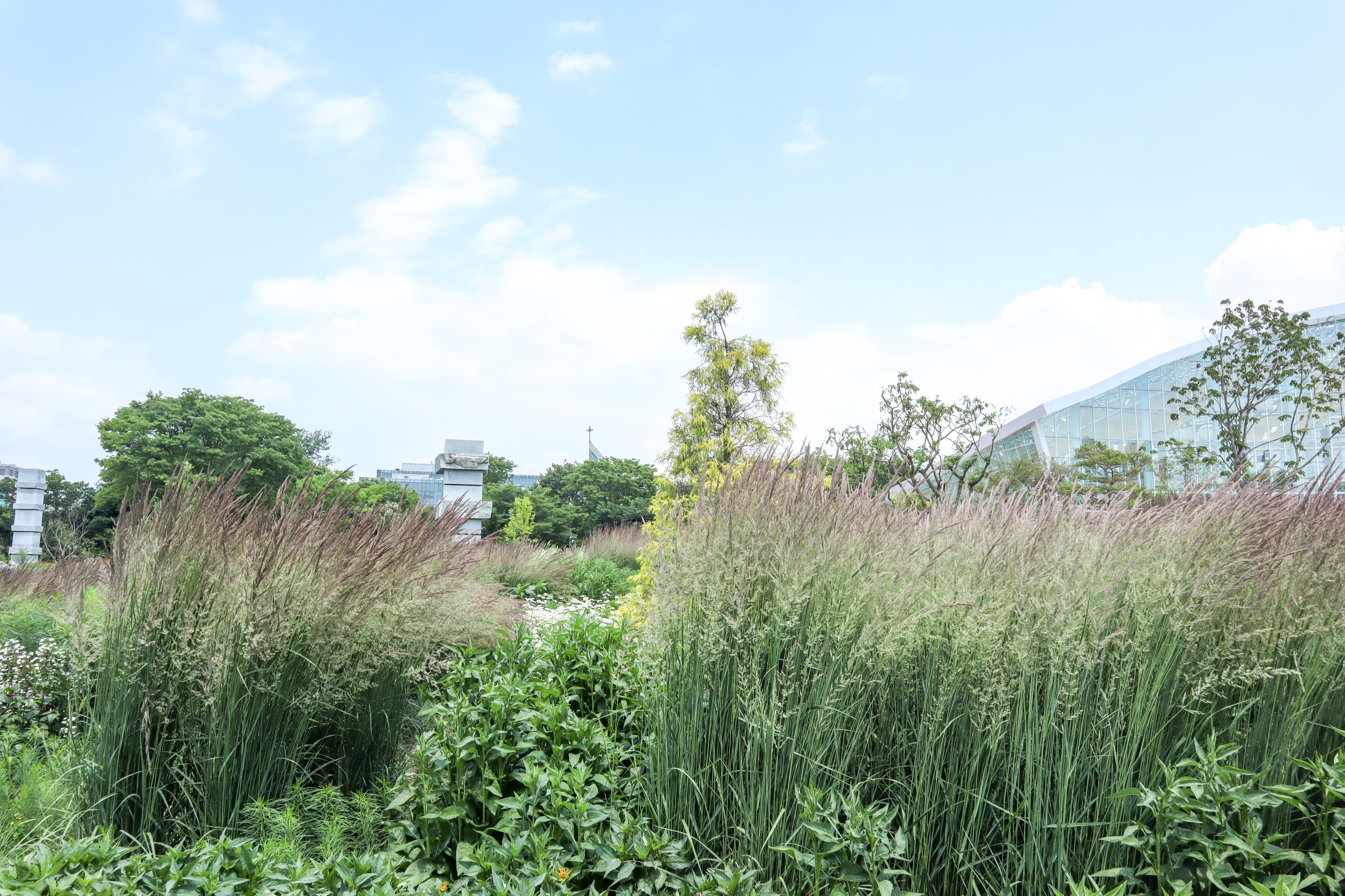 다음으로 제가 이 수목원에서 좋았던 곳은 그라수원인데 다양한 그라스들이 심어진 곳으로 조각 작품들도 곳곳이 있어서 풍경이 너무 좋았지요. 실내온실을 배경으로 사진을 찍어도 화사하고 좋은데 가을이 되면 더 멋질 것 같습니다.