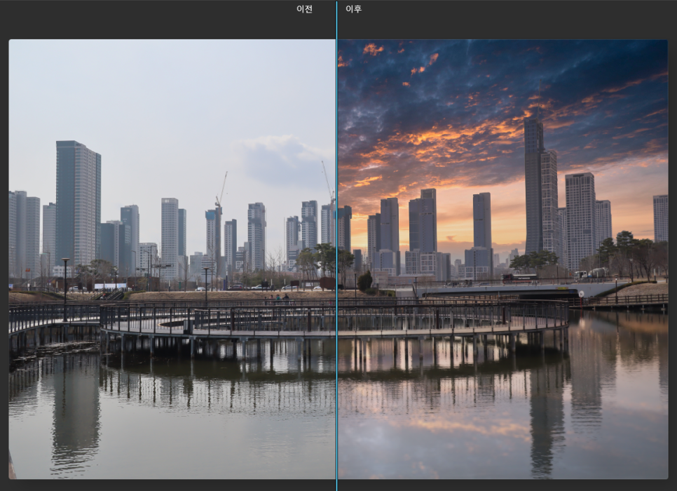 Luminar AI에서 가장 특징적으로 내세우는 기능이 바로 크리에이티브 스카이 기능인데 Luminar4의 경우와는 차별적인 변화를 줄수 있는 것이 핵심이라고 보면 됩니다. 하늘을 보정하는 기능으로 동일한 사진을 간단히 보정한 결과를 비교해서 보시면 아실꺼예요.