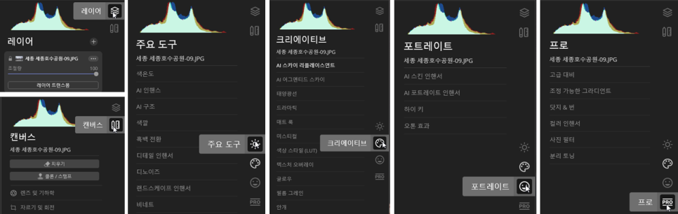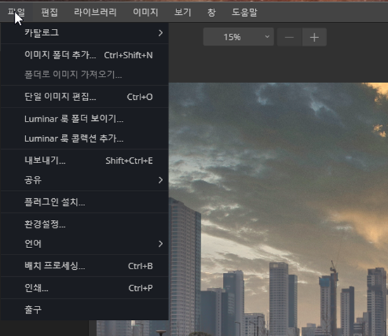 도구의 표시 방식도 변화가 있는데요. 메뉴는 먼저 Luminar4의 메뉴들은 다음과 같은 구조로 되어 있지요.