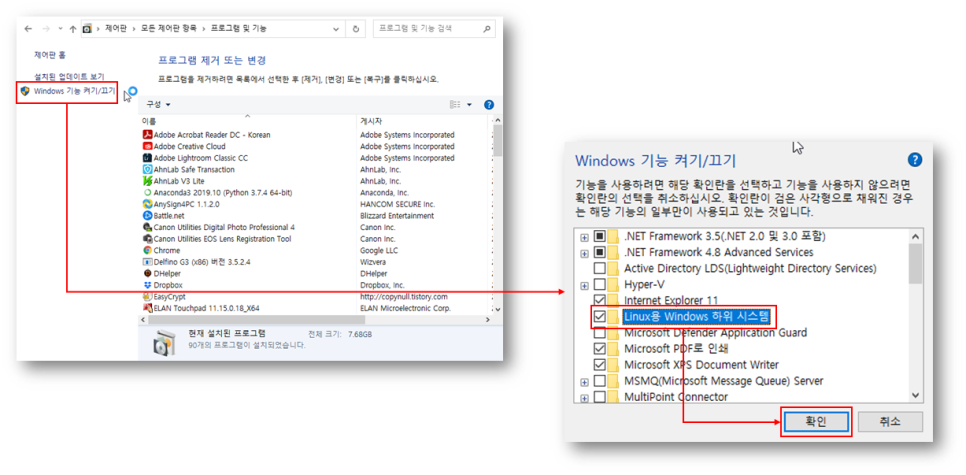 2. [Windows 기능 켜기/끄기]를 실행합니다. 목록 중에서 ‘Linux용 Windows 하위 시스템’ 을 선택하여 체크하고 ‘확인’을 클릭합니다.