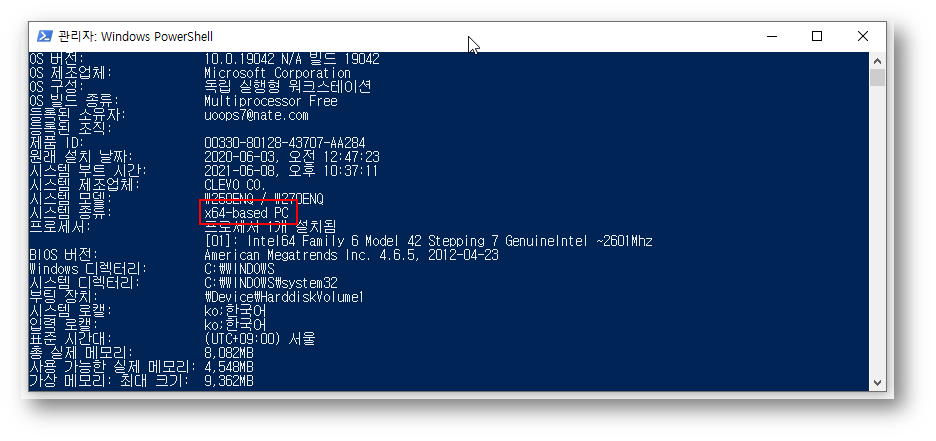 업데이트를 하려면 자신의 시스템에 맞는 프로그램을 다운로드 받아야 하는데 대부분은 X64일 것이지만 혹시 모르니 PowerShell에 ‘systeminfo’를 입력해 봅니다.