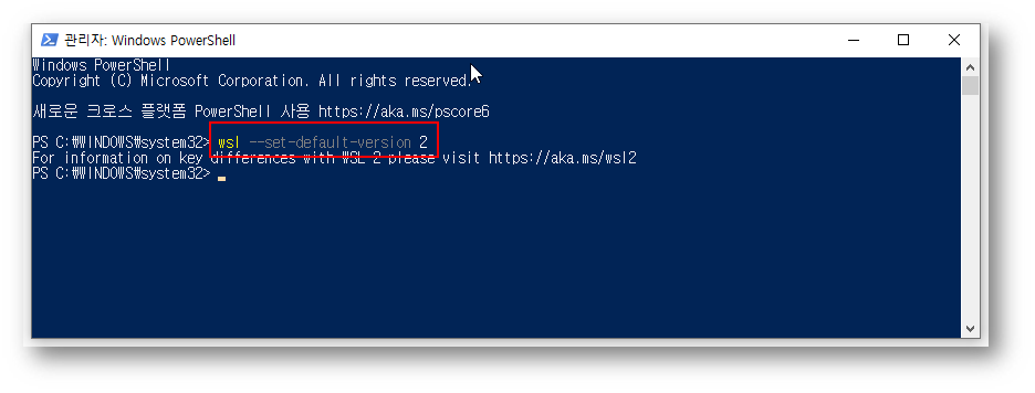 업데이트를 설치했으면 이제 WSL2를 항상 사용하도록 설정을 해 주면 됩니다.