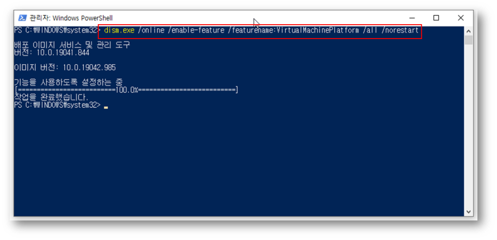 WSL 활성화를 위한 명령입니다. 설치 참고 페이지에 나와 있는 것이지요.