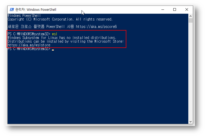 4. 그리고 PowerShell이나 명령 프롬프트 프로그램을 실행해서 ‘wsl’이라고 입력해 보면 그림과 같이 메시지가 출력됩니다.
