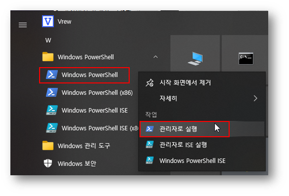시작의 메뉴 중에서 Windows PowerShell 프로그램을 마우스 오른쪽 버튼으로 누른 후 ‘관리자로 실행’을 클릭해서 실행해 주어야 합니다. 앞으로 PowerShell 실행은 항상 이렇게 관리자 권한이 필요하니 잊지 마세요.