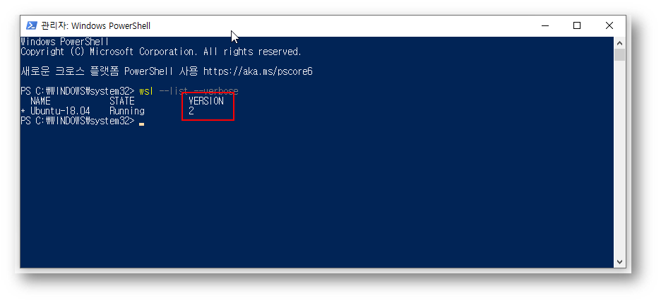 PowerShell에서 현재 동작 중인 WSL의 버전을 확인해 봅니다.